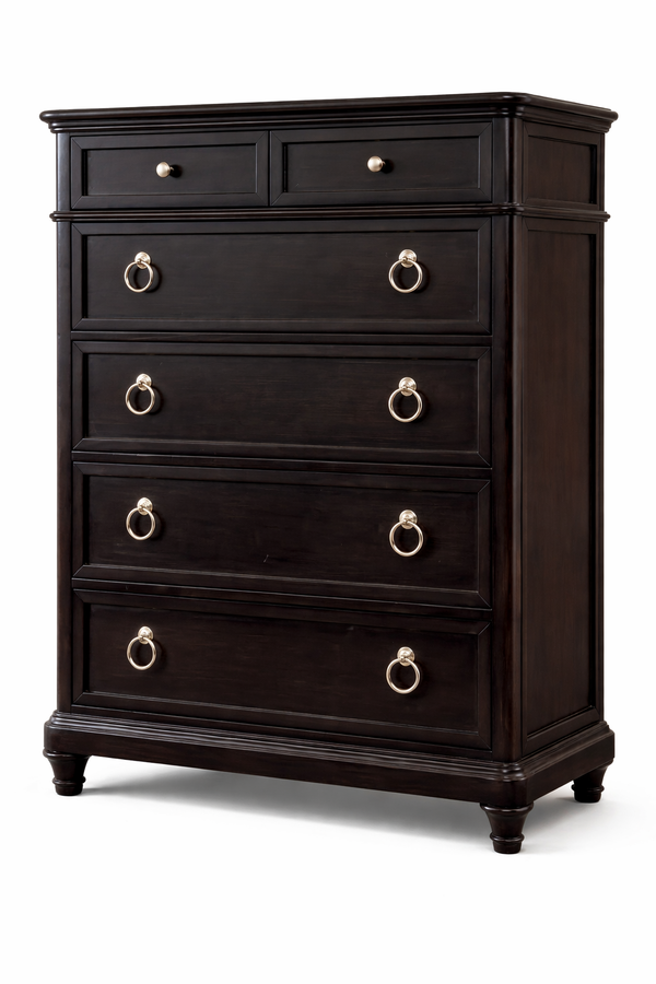 The Byron Chest blends timeless elegance with practical storage. Crafted with a deep, rich finish and refined moulding details, this chest brings a sophisticated presence to any bedroom interior. Its multi-drawer configuration offers generous storage for clothing and personal items, while the elegant metal ring pulls add a subtle touch of classic luxury.